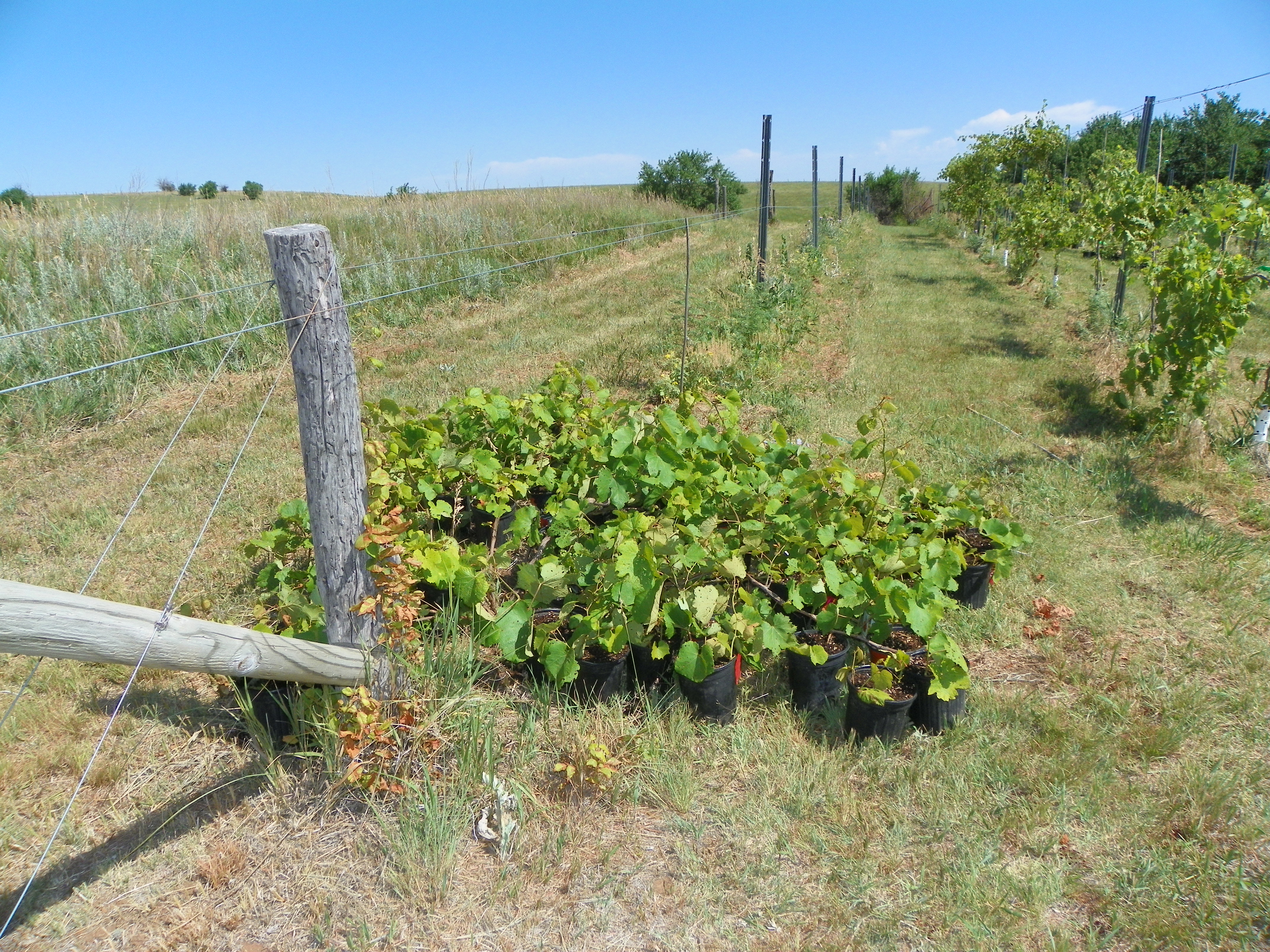 Our first planting was Chardonel during the spring of 2000 and Cynthiana later that fall. Unfortunately Kansas entered and extended drought which caused severe losses those first years. We replanted Chardonel in 2007 and added Chambourcin which have now come into production. In 2011 we added an acre of Crimson Cabernet, a half acre of Cabernet Doré, and more Cynthiana. Spring of 2012 we will add Aphrodite.